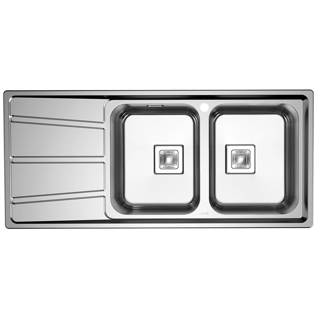 سینک آلتون 1161 R لگن راست این مدل سینک ظرفشویی دارای دو لگن سمت راست با قابلیت نصب توکار به همراه ورق استیل با ضخامت ورق 0/8 میلیمتری تولید میگردد. کیفیت این محصول بسیار مناسب میباشد