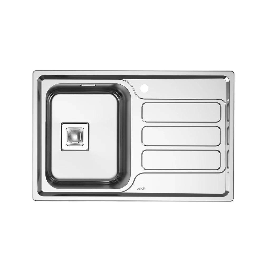 سینک آلتون 801 L لگن چپ این محصول دارای ابعاد 80 در 52 سانتی متر با عمق لگن 20 سانتی متر . از ویژگی های این مدل میتوان به ورق استیل ضد زنگ خش دار (0/8 میلی متر) اشاره نمود